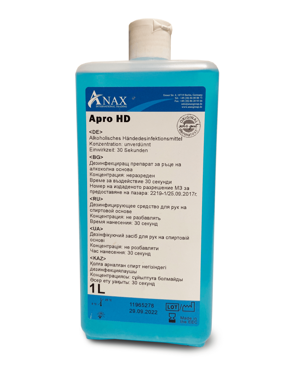 APRO HD является надежным, быстродействующим дезинфицирующим средством и испаряется без остатка. Имеет широкий спектр действия против микроорганизмов, а также эффективен против вирусов и грибков. Для гигиенической дезинфекции рук 3 мл APRO HD растирают по рукам в течении 30 секунд.
