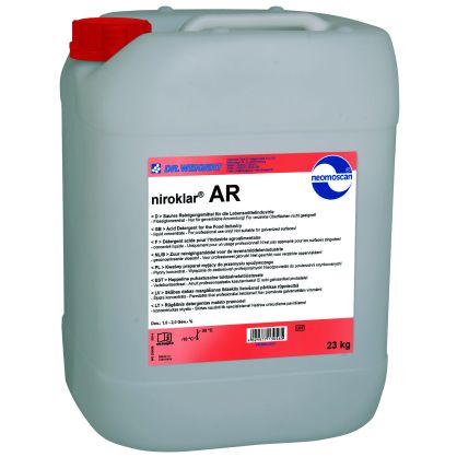 Niroklar AR — жидкое, кислотное моющее средство на основе фосфорной кислоты в комбинации с сильнодействующими пенообразующими смачивающими веществами и эмульгаторами.